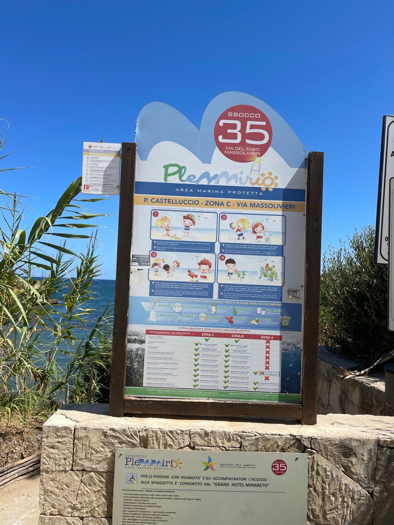 I tanti punti d’accesso al Plemmirio sono numerati. Si e’ da soli senza persone addette al salvataggio ed alcuni posti sono abbastanza difficili da raggiungere!
