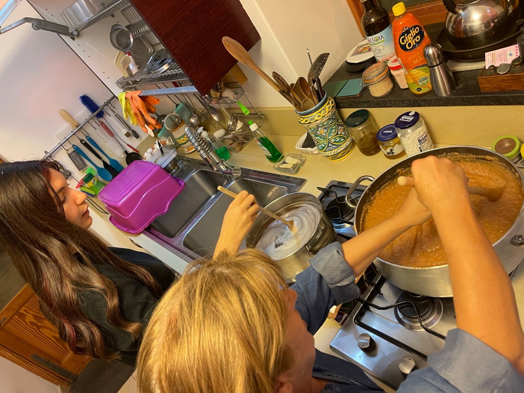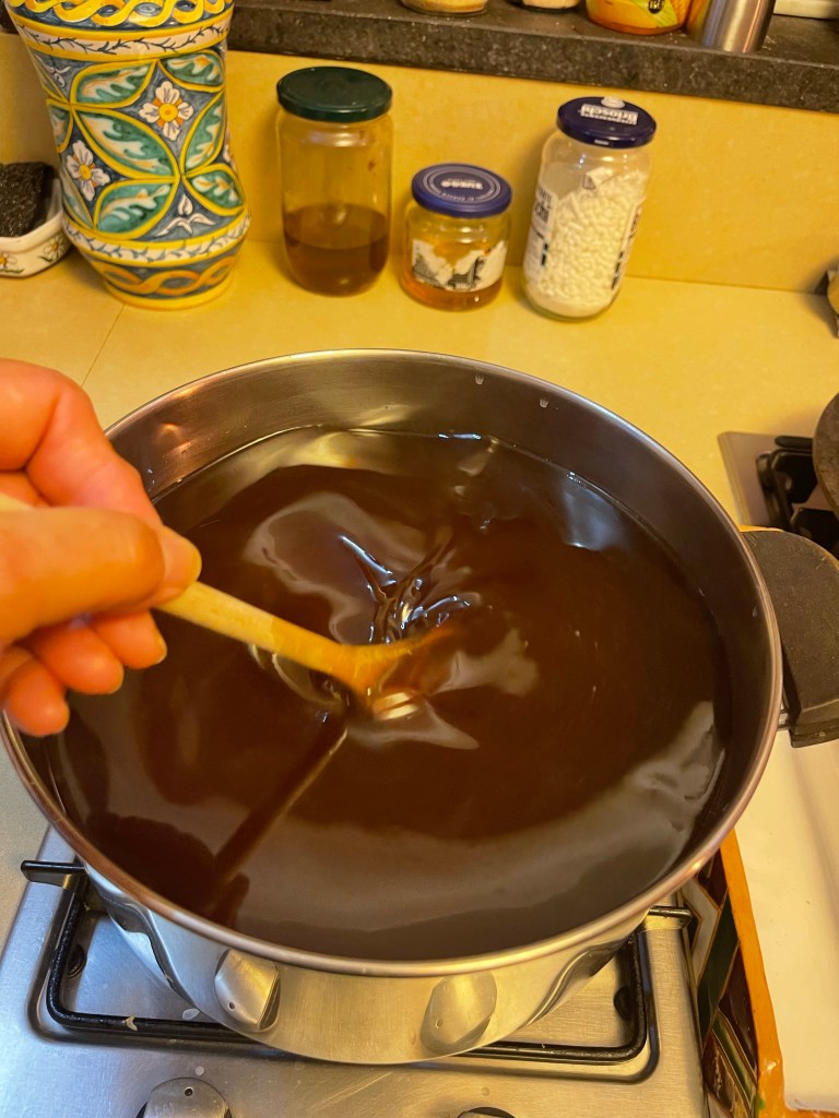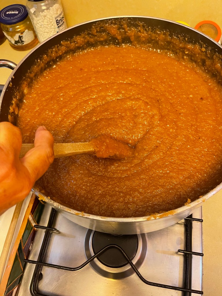 Quindi e’ iniziato il processo di mescolare mentre la miscela cuoceva. Durante la cottura, la miscela diventa più’ densa e scura ed ieri questo processo e’ durato per 45 minuti. Come mi ha detto Robi, l’impasto e’ cotto quando sfrigola in un modo particolare.