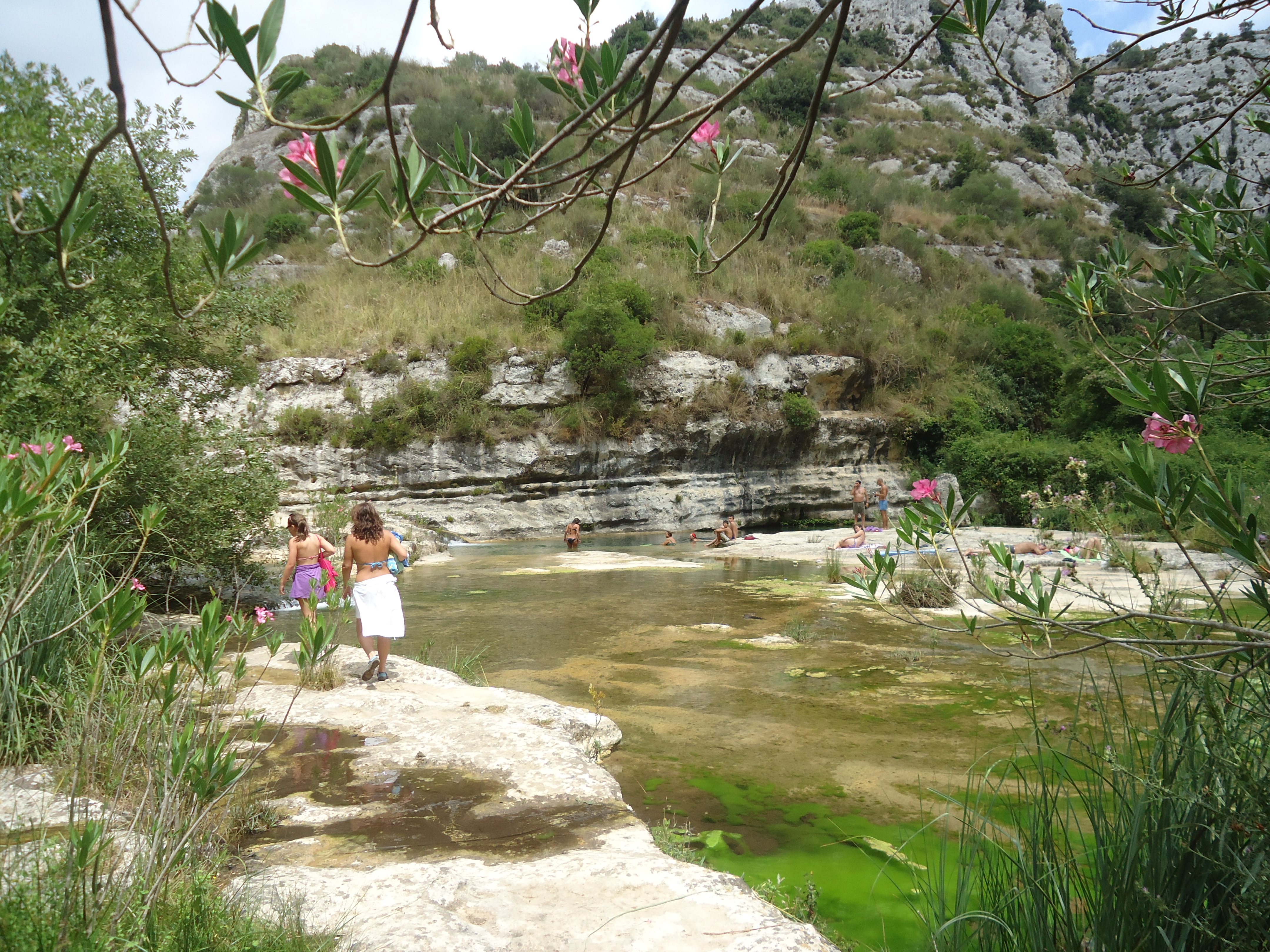 Riding a motorbike driven by Luigi, Luigi and Sara lead us from Solecaldo to Cavagrande. We parked our car and started the 45 minute hike down this gorge with so many wild herbs and fragrances. As one arrives at the bottom, there is an oasis of plush vegetation, flowers and small lakes. The swim in the lakes is energizing and everyone had a great time. Hiking back up was not as bad as one had feared and along the way up some visitors we had met at Solecaldo enlightened our ascent explaining detials about the vegetation. In the picture one can see a wild pistacchio plant encountered along the way back. Certainly an excursion one would recommend to nature lovers.