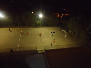 The town was alive with people walking, talking and enjoying the cool summer breeze and the soccer field was lit up for a friendly evening match.