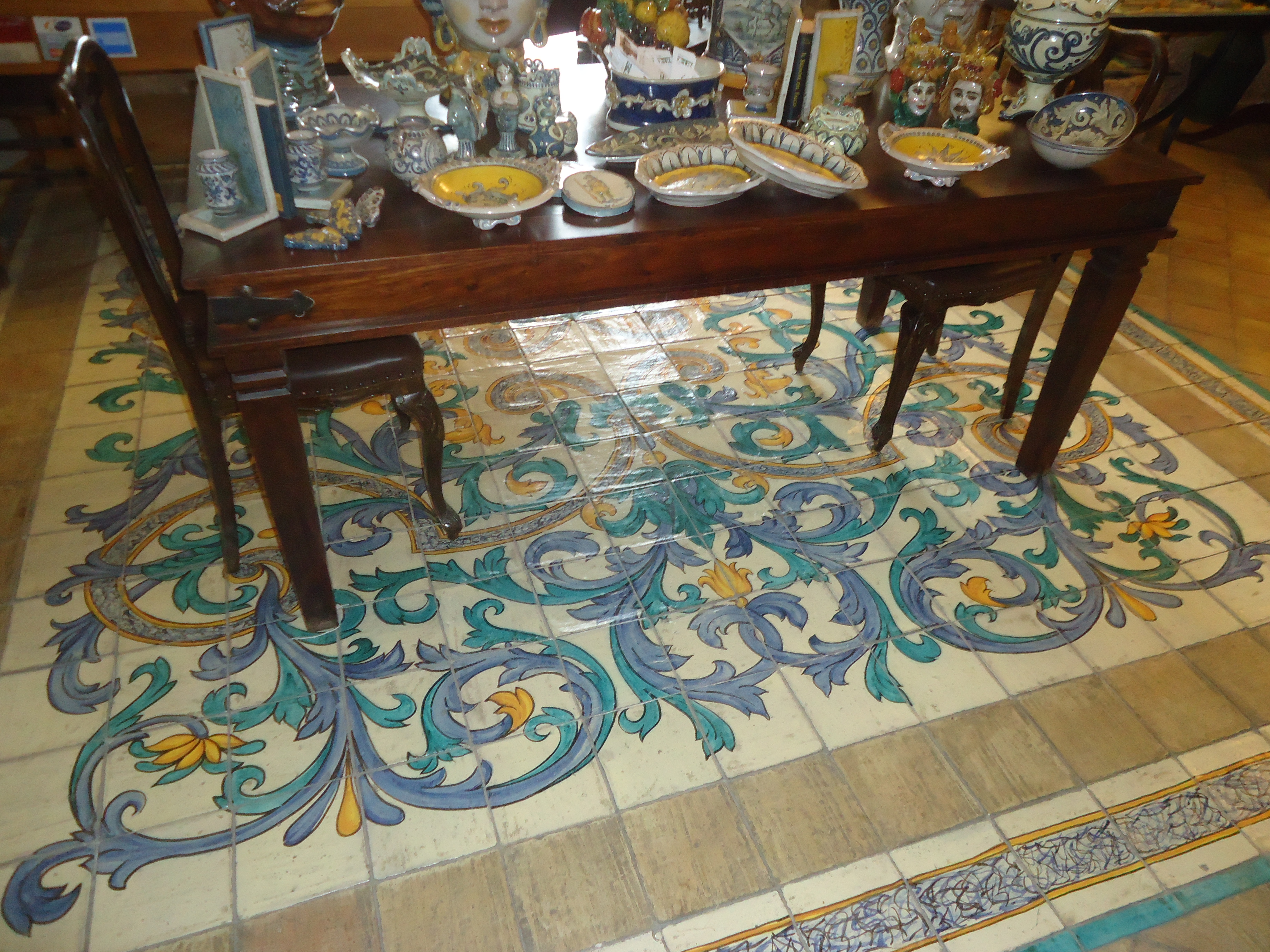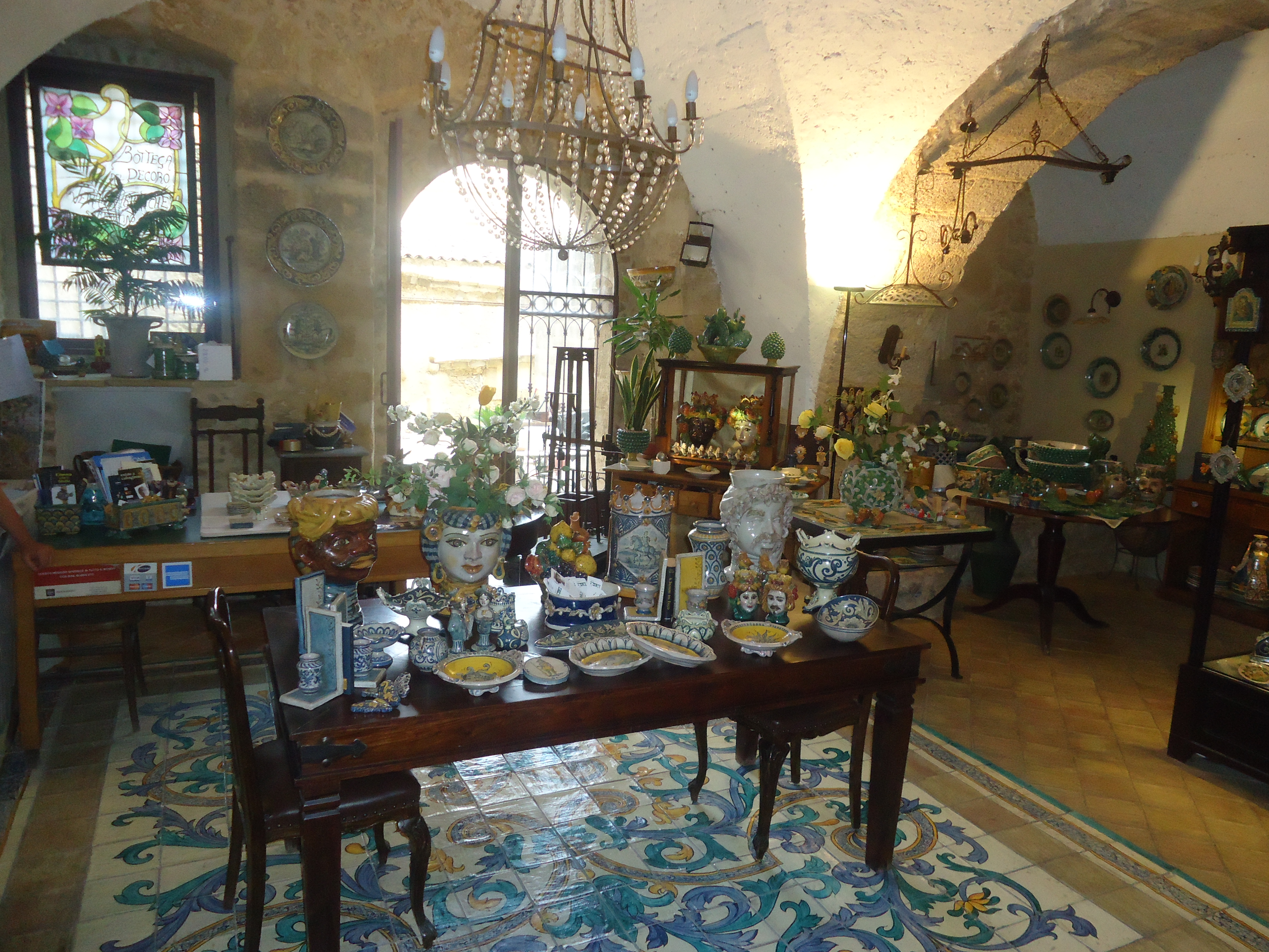 Caltagirone is famous for its ceramics. The current ceramic artists re-create many patterns of the past centuries.  These pictures show some ceramics on display in a shop, the famous stairs adorned in ceramics, and the ceramic decorations of some walls in the town.