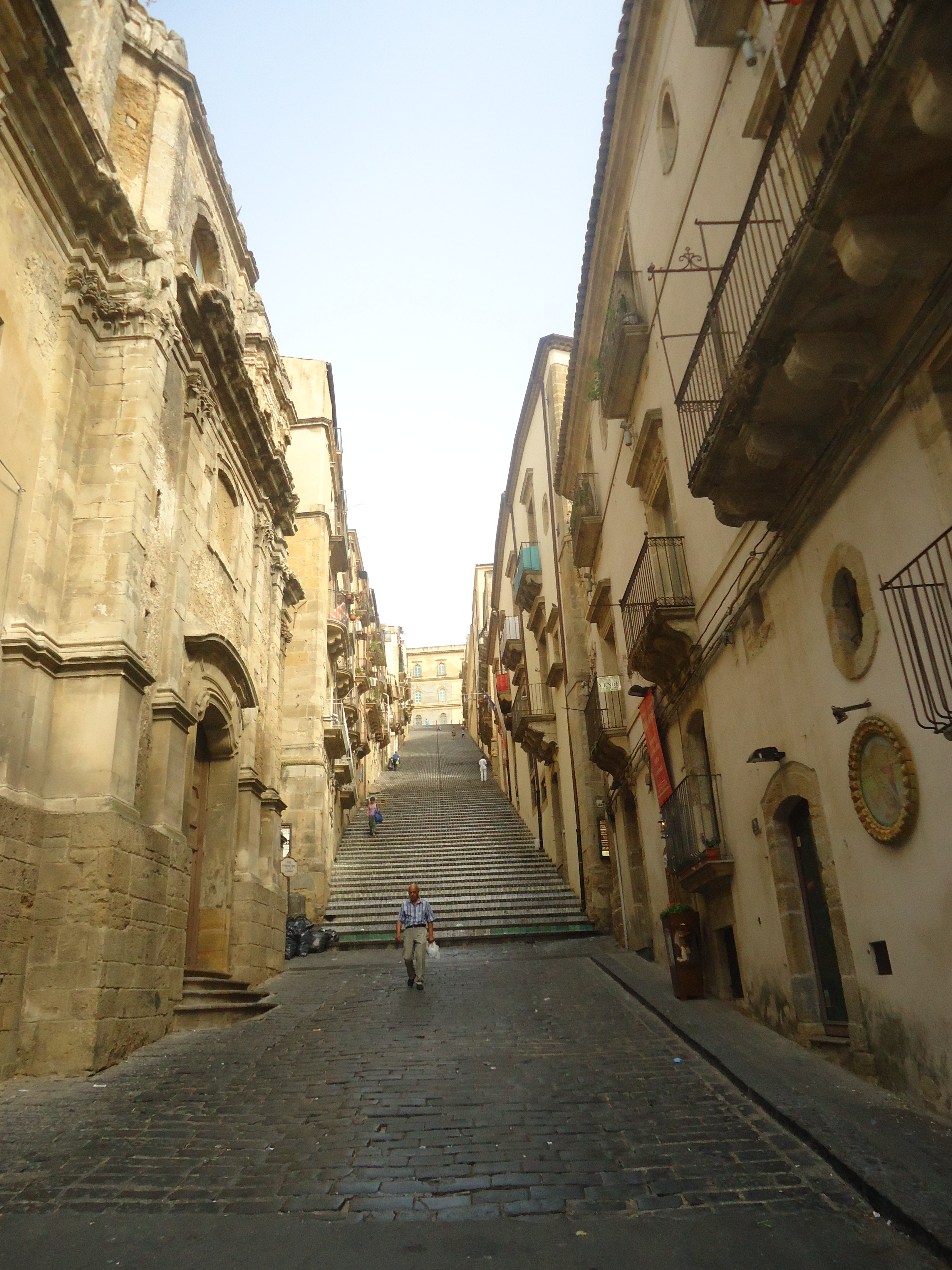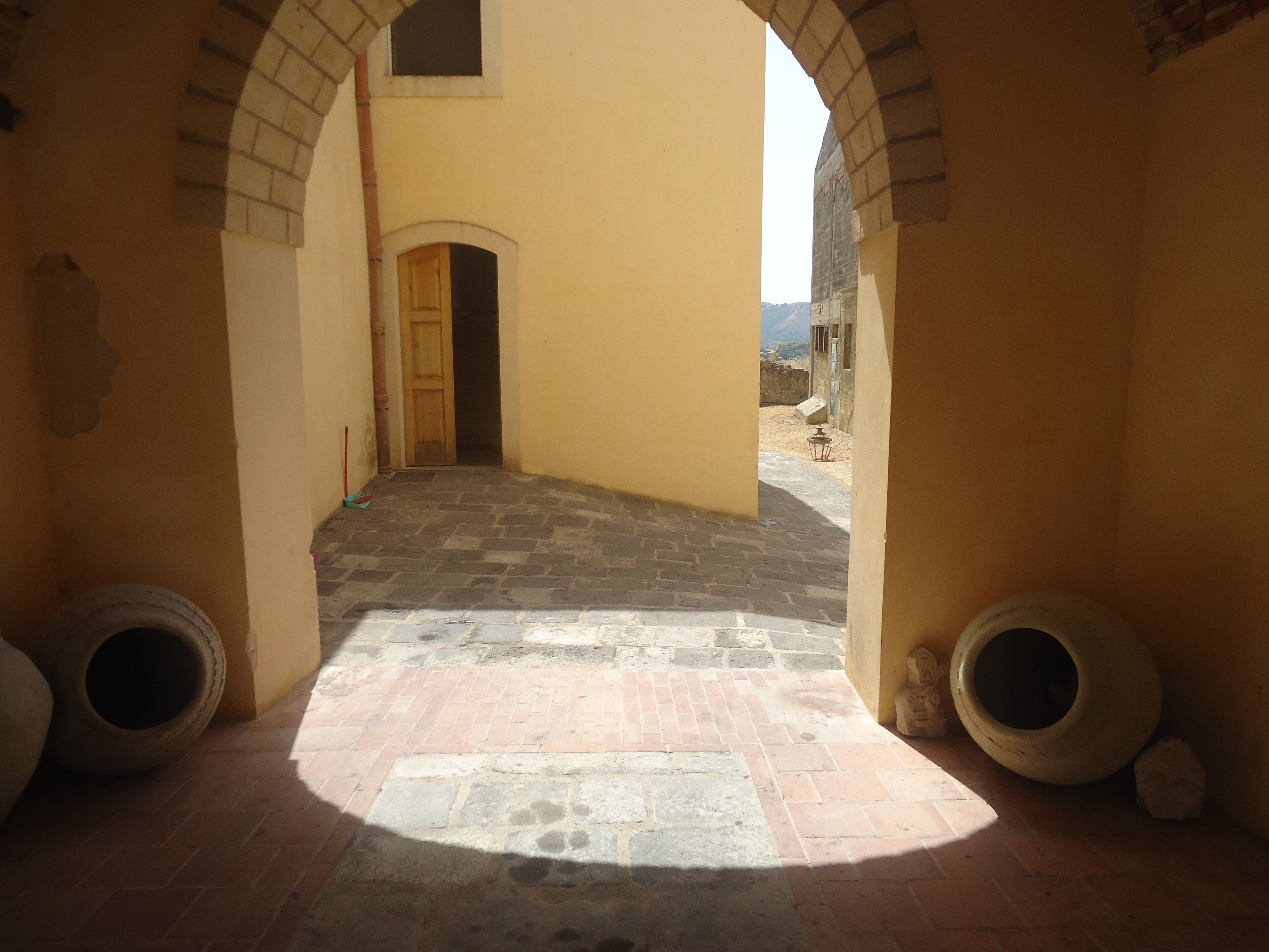 Leaving Catania and heading S.W., one travels along the Piana di Catania, Catania Plains.  At the beginning of September, after months with no precipitation, the terrain is very dry and at times one can see  fires along the way.  My plans were to spend the night in Caltagirone, visiting Maria, my childhood friend, but I wanted to stop in Licodia Eubea on the way.    After passing the Plains, one takes SS194 , heading S.W.  Along the way, there are orchards, olive groves, and  fields of prickly pears.  After arriving in Licodia Eubea, I parked the car and enjoyed a walk thorugh the town.  The annual Grape Festival was to be held that night, so the town was buzzing with all the preparations.  I enjoyed the architecture of the town as some examples can be seen in these pictures. In its past history, this town was inhabited by the Greeks, the Romans and the Arabs.
