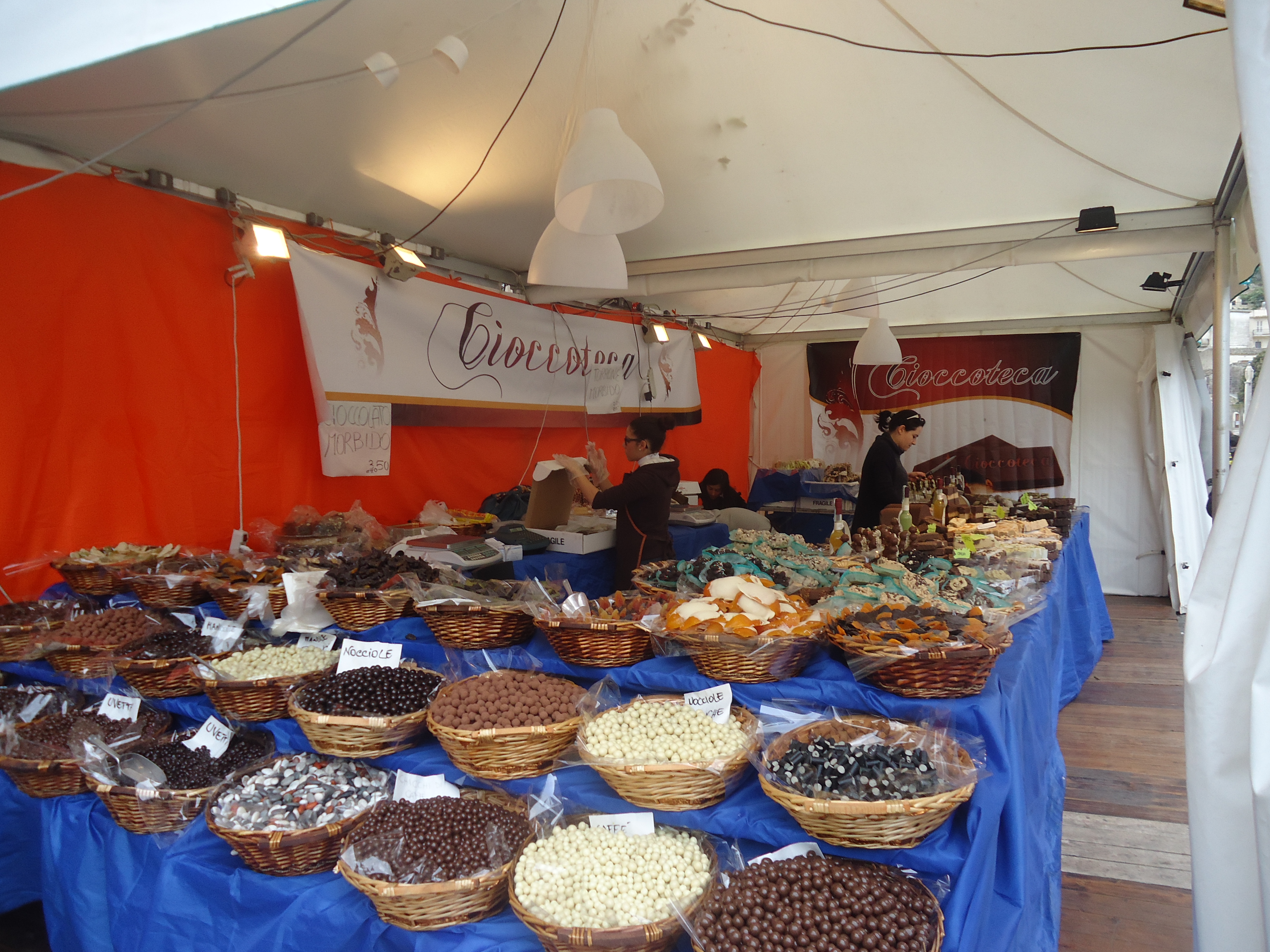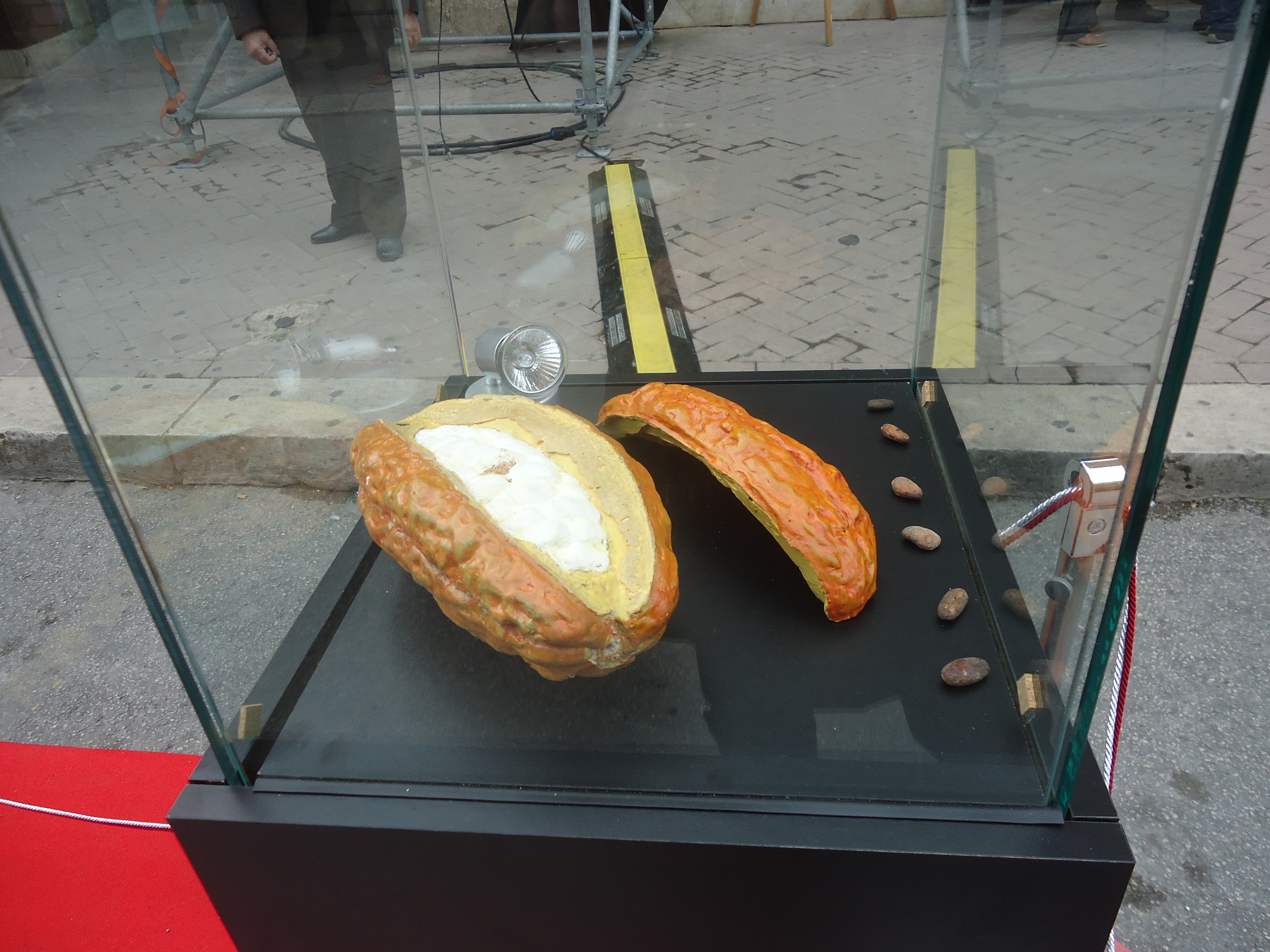 During Chocobarocco, a stroll down the main street, Corso Umberto,  offered an array of chocolates of many colors and kind, dark chocolate, cinnamon chocolate, carrub chocolate, pistacchios, and too many to mention.    There was a exhibit on the history of chocolate making in one of the buildings  and on display, in glass cases on the street, the ingredients which are used during the process. Below are pictures taken at Chocobarocco  2011 in Modica Bassa.