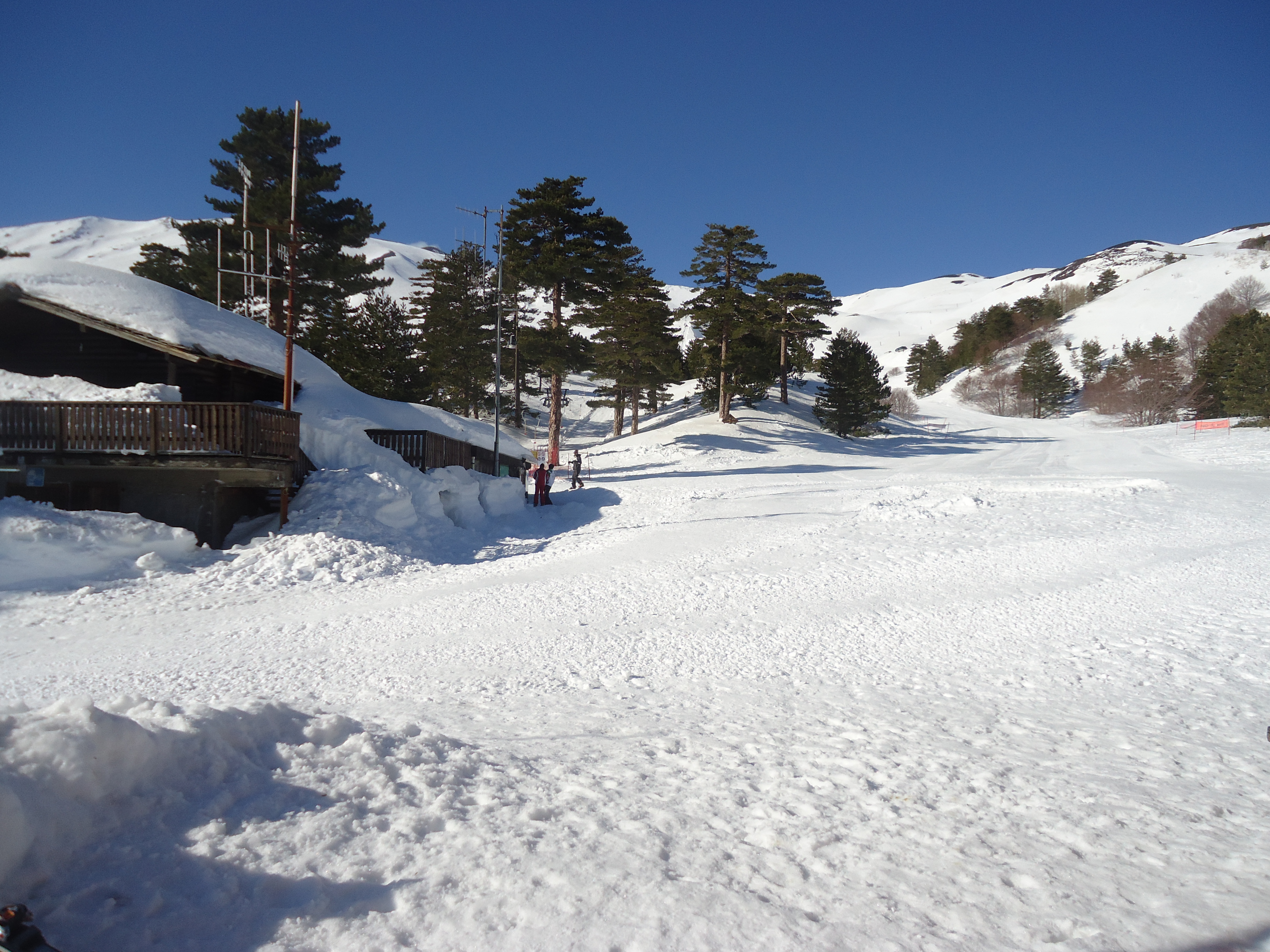 The drive from Catania on the eastern coast of Sicily to Linguaglossa, northern side of Mt. Etna, is a pleasant 45 minute drive with a view of the volcano to the left and the Ionian sea to the right. Along the way, one can enjoy the beautiful views of the towns perched on the mountain and those lying along the coast. At one point, the climb up the mountain takes the traveler up a pine forest, all the way to the skiing resort of Linguaglossa. The ski resort is at approximately 1,800 meters altitude.