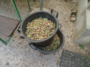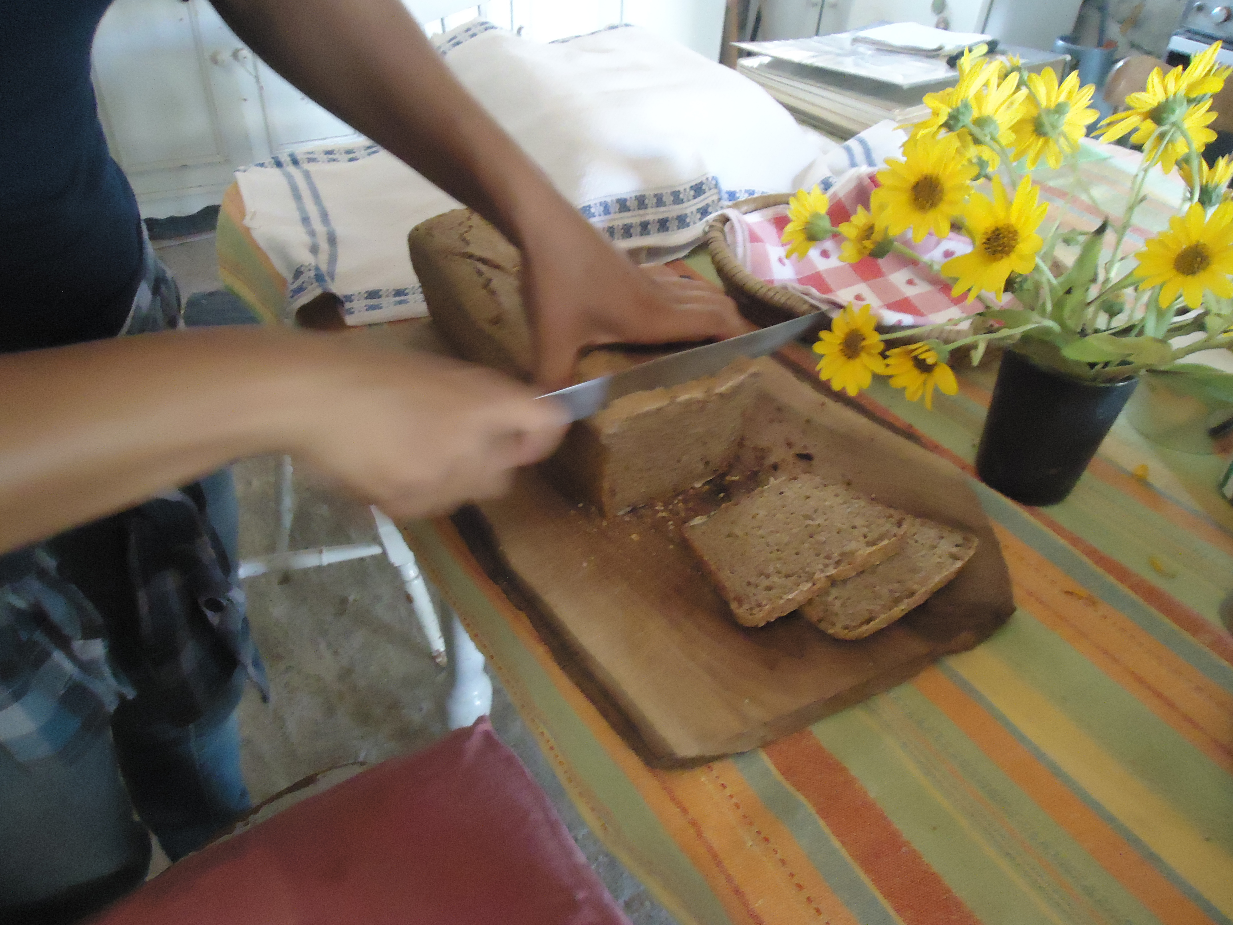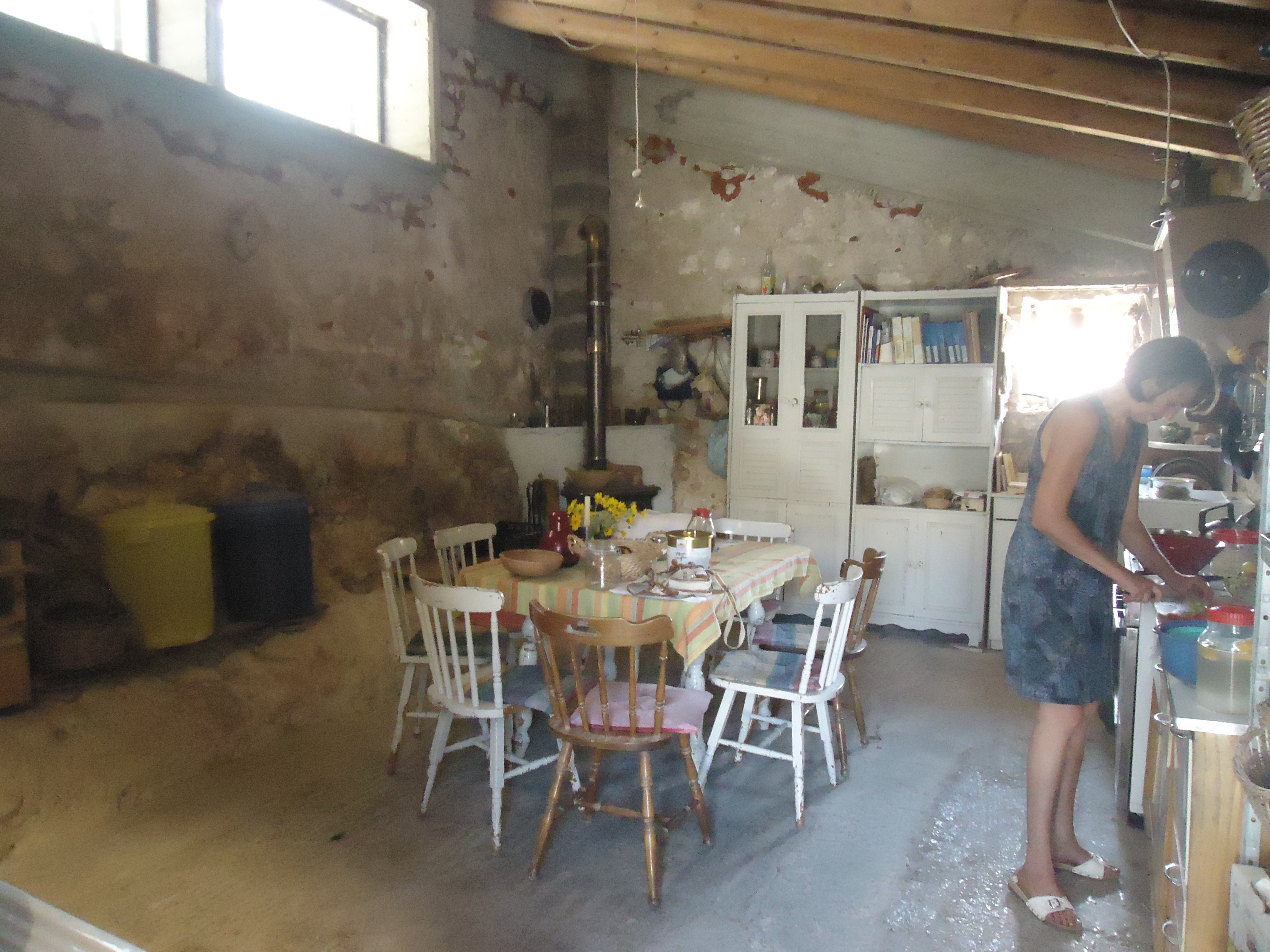 The day I visited, in September, it was almond picking time; I met a young Woofer from Brazil as she returned for lunch after picking almonds. Renate had been busy preparing a lunch made exclusively with produce from her vegetable garden and home backed bread and cake.