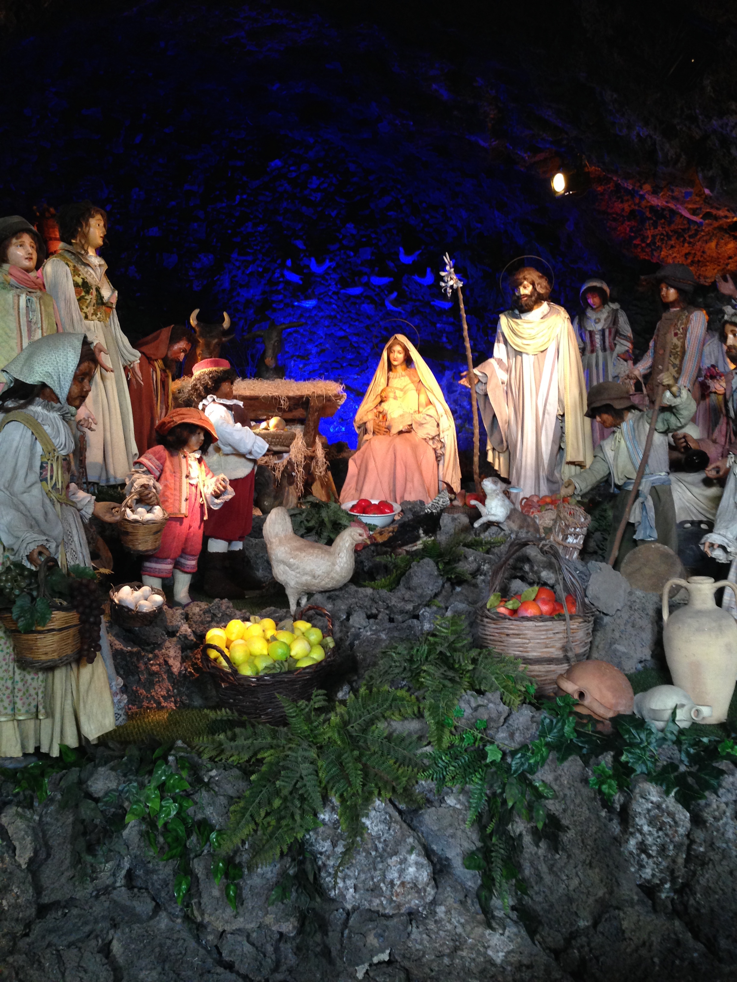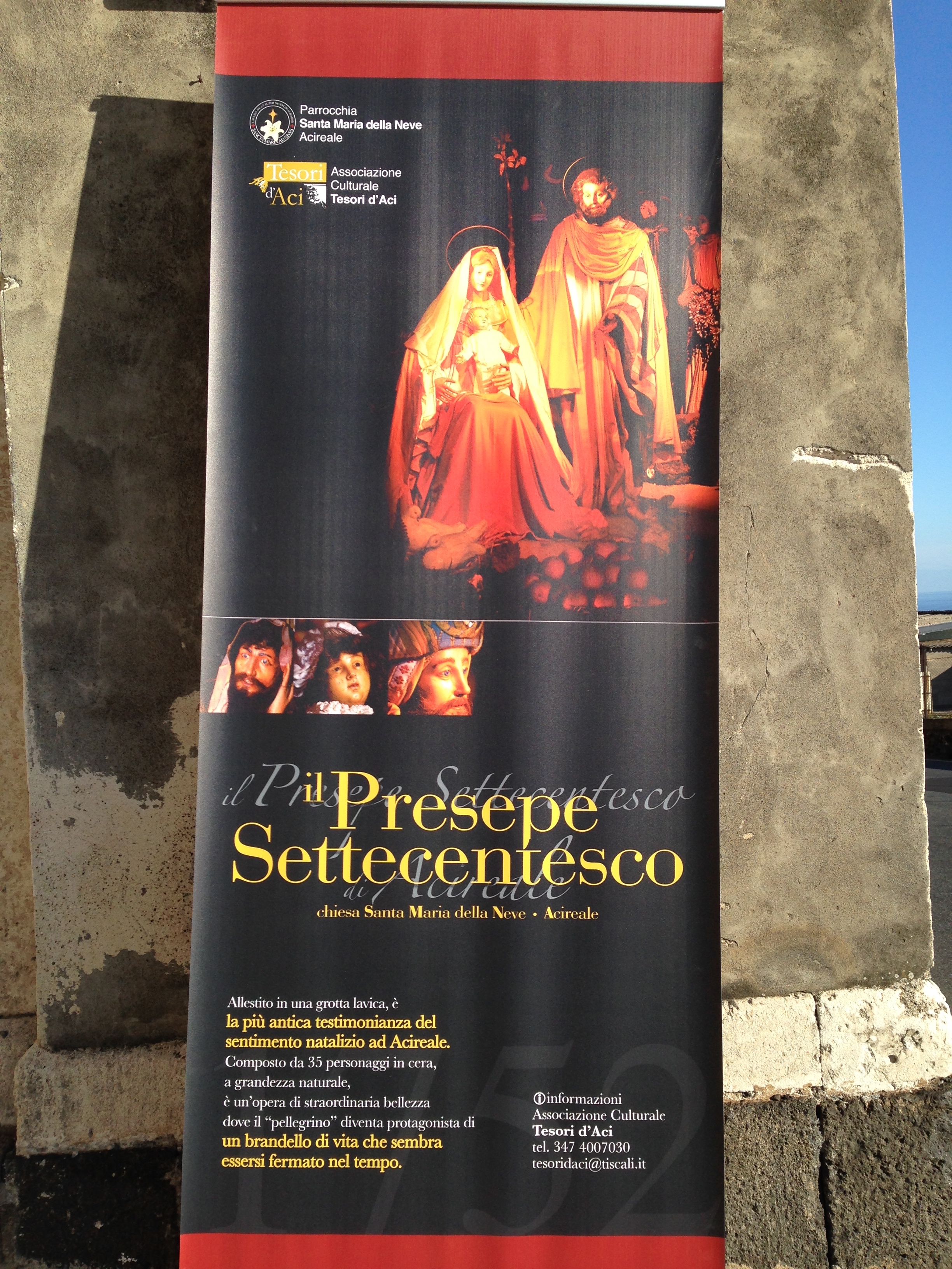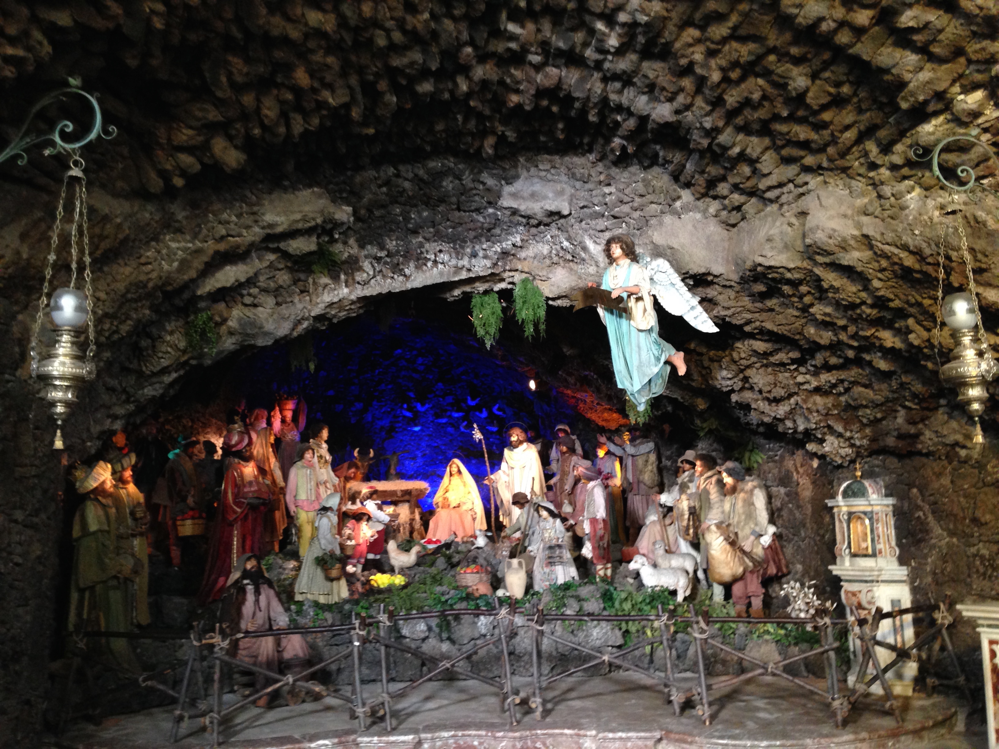 Driving along the Eastern coast of Sicily, not far from the city of Catania, is the town of Acireale. This towns offers visitors the opportunity to visit a Nativity which dates back to the mid 1700’s. The Nativity, located on a road leading down from Acireale to the towns overlooking the sea, is located in a cave, “a rutta”, inside a church, the Chiesa S. Maria della Neve.