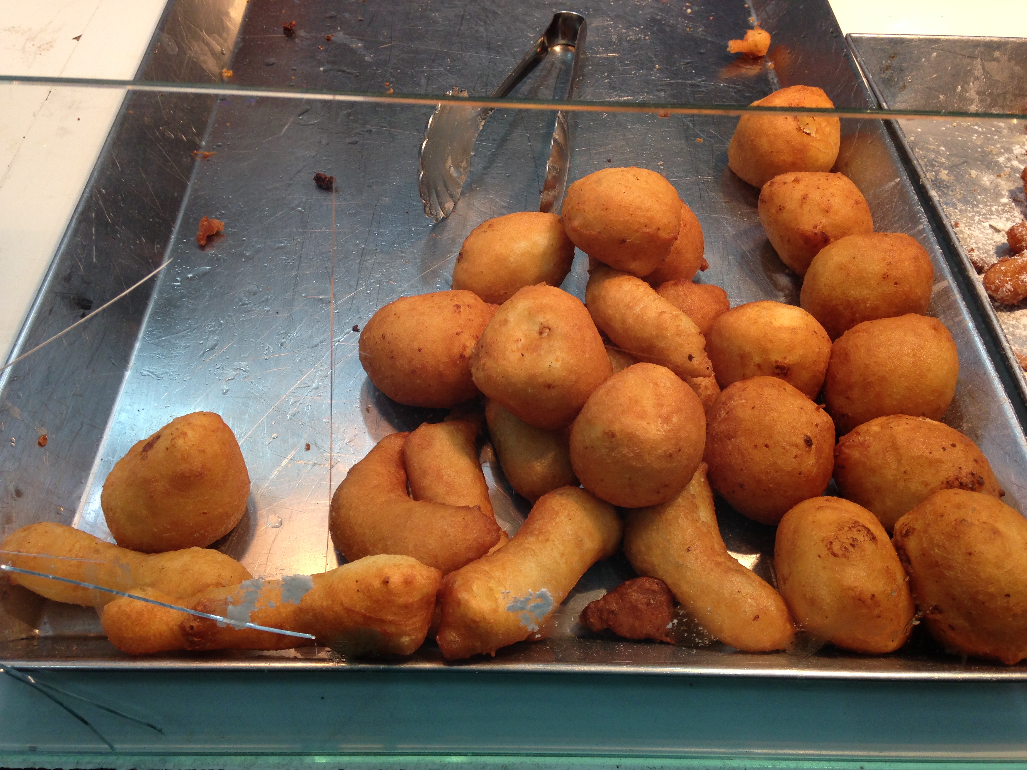 Besides the swordfish, there were also “crispelle” as seen in the picture below. These are fried stuffed dumplings which are stuffed with either ricotta cheese or anchovies. To distinguish one kind from the other, the ricotta ones are round and the anchovy ones are elongated.