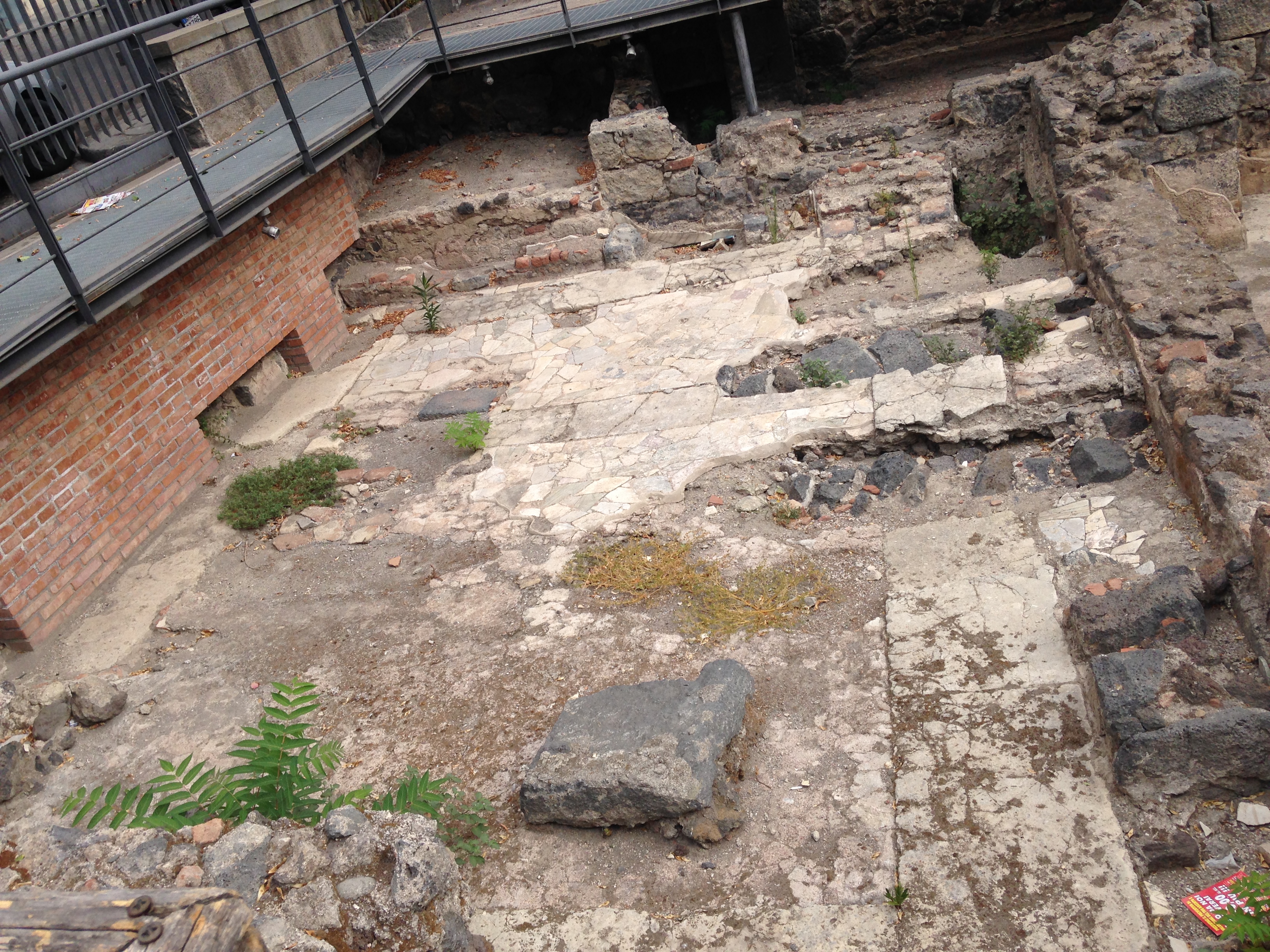 Nowadays, what remains of the Roman Baths is below street level. The Baths were built in the first century A.C., modified in the third and abandoned in the fifth. Roman Baths were an important element of Roman lifestyle and when the Empire ended so did their purpose, as the Christian lifestyle of the times did not lend itself to this kind of practice.