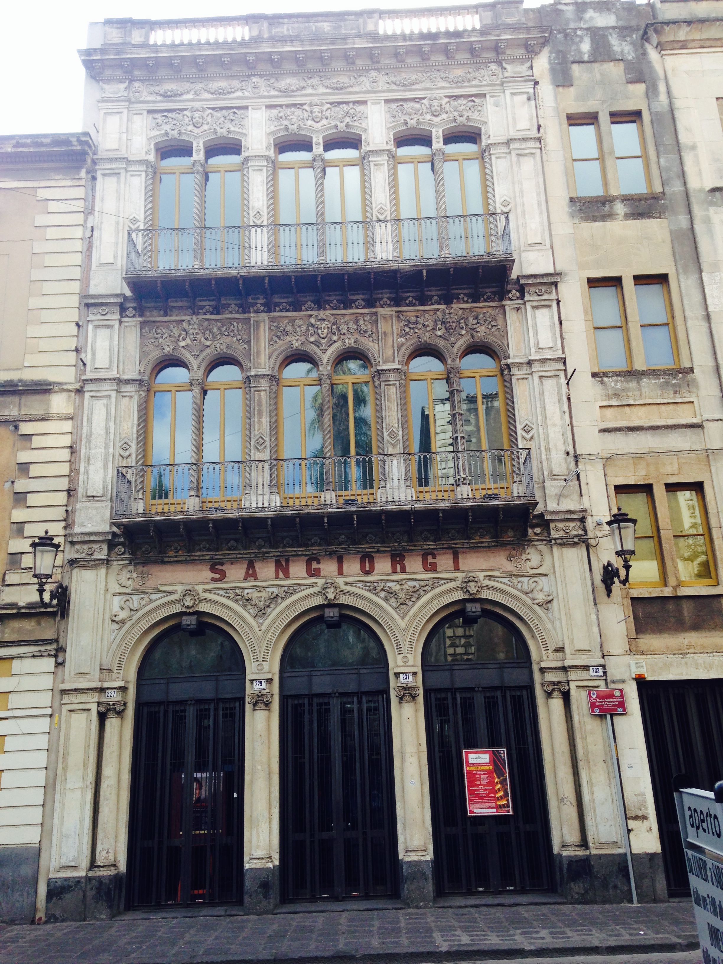 The Sangiorgi Theater was built in 1860. Its architect, after whom the Theatre was named, came from a humble local family. Sangiorgi traveled abroad and brought his newly acquired knowledge of architectural styles back to Catania. This building portrays a style that was influenced by Sangiorgi’s visit to Paris. During the early 1900’s this was one of the great places in the city. Here there was a hotel, a restaurant, cafe’, the theatre which offered performances that were more in the style of Cafe’ Chantal in Paris than other local theatres.