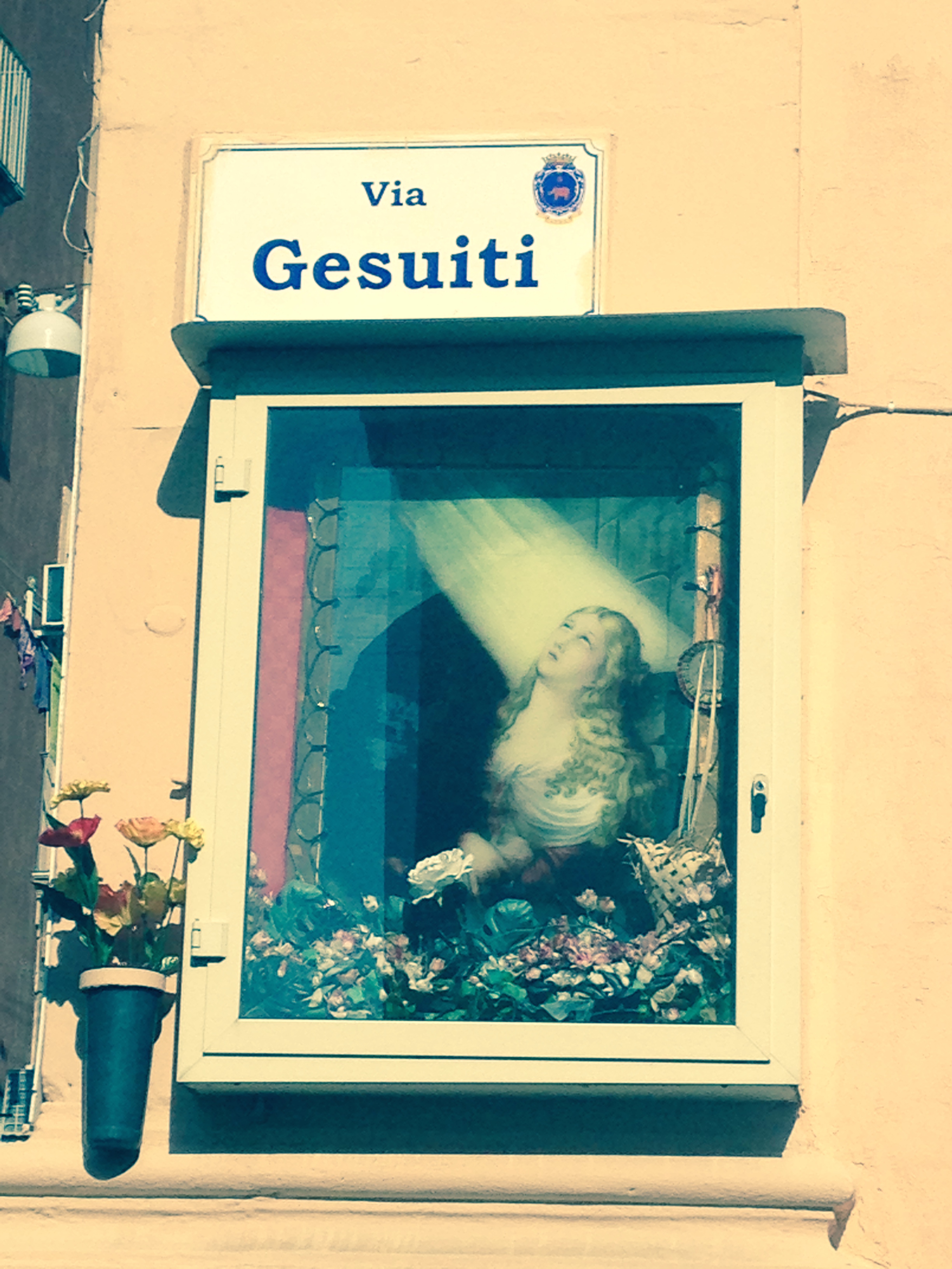 These “altarini” usually represent religious figures and people stop for a moment of reflection and some also place fresh flowers in the proximity.